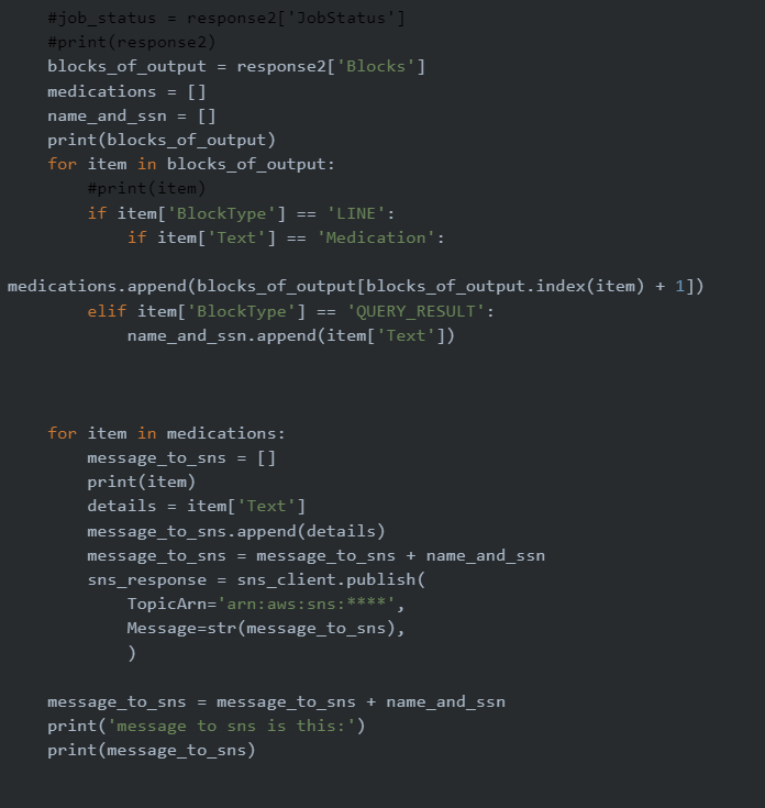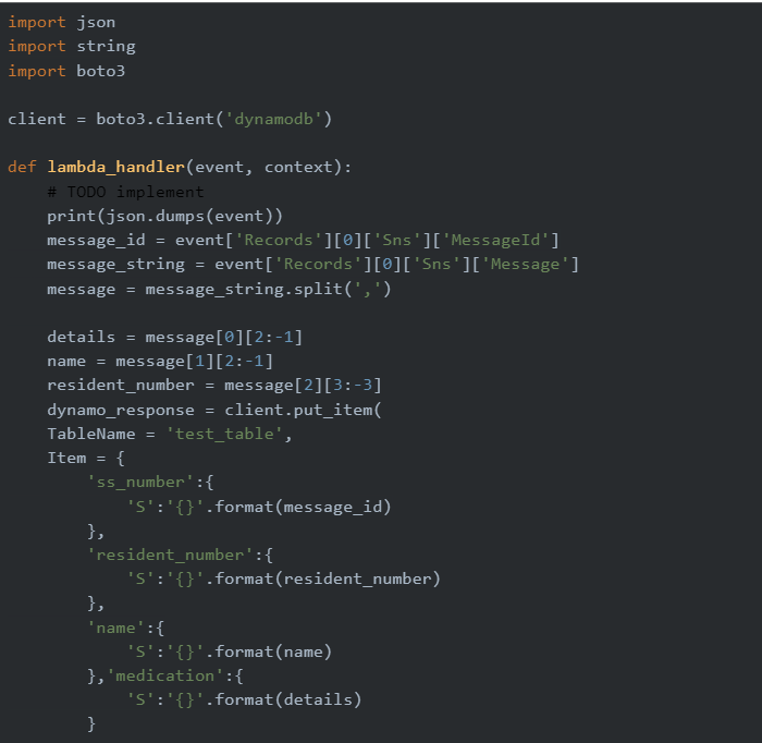 When the message is published to Amazon SNS topic, the final lambda function ‘store to database’ is triggered. This function gets the message and puts the necessary item to dynamodb using client.put_item() method. The items put are name, resident number and details.