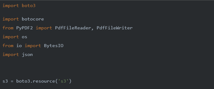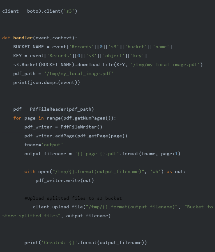 As shown in the architecture diagram above, an input bucket is created to store the original PDF file. A lambda function ‘PDF Splitter’ is created and it is configured so as to be triggered from S3. An ObjectCreatedPut Event trigger is set up for the ‘PDF splitter’ lambda function with the S3 bucket set as the input bucket. The lambda function’s runtime is selected as Python 3.8 and various libraries like boto3, PyPDF2, io, os, etc are used to execute the required task. The split files are then stored in another bucket ‘Bucket to store split files’