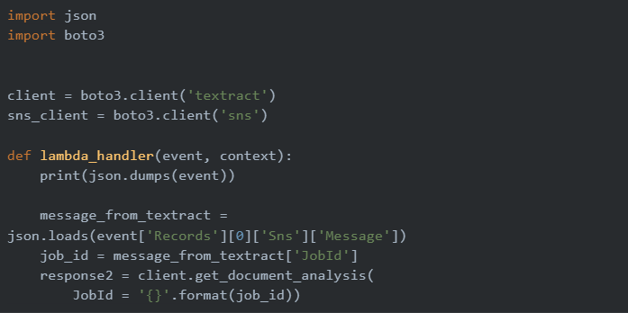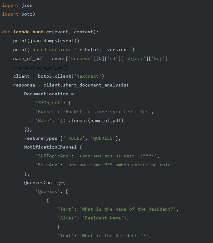 Now, another lambda function ‘Textract Invoker’ is created and is triggered by the S3 bucket ‘Bucket to store split files’. This function starts the document analysis process using Amazon Textract and sends notifications using SNS as a Notification channel. Amazon Textract feature types like Tables and Queries are defined and the Queries are configured so as to extract the required information.